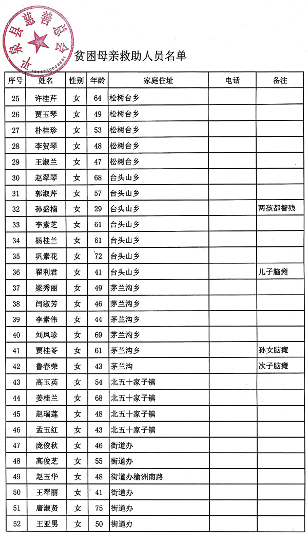 附援助名单:平泉县贫困母亲(110位,每位贫困母亲发放善款2000元。)