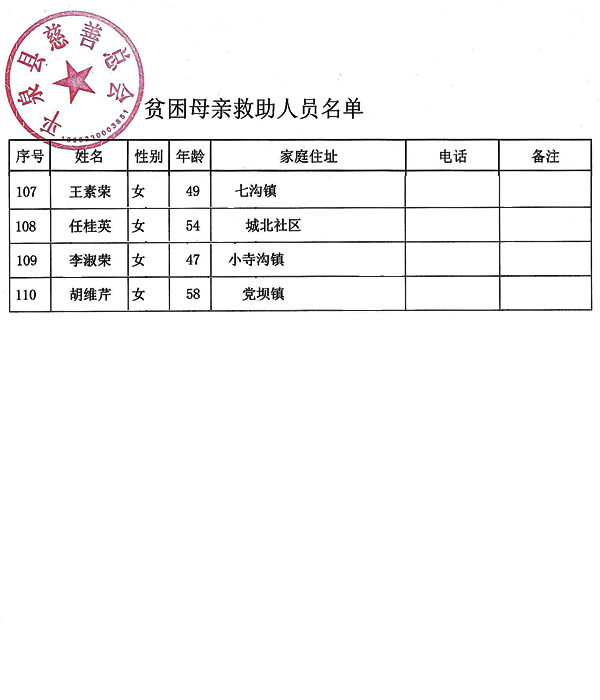 附援助名单:平泉县贫困母亲(110位,每位贫困母亲发放善款2000元。)