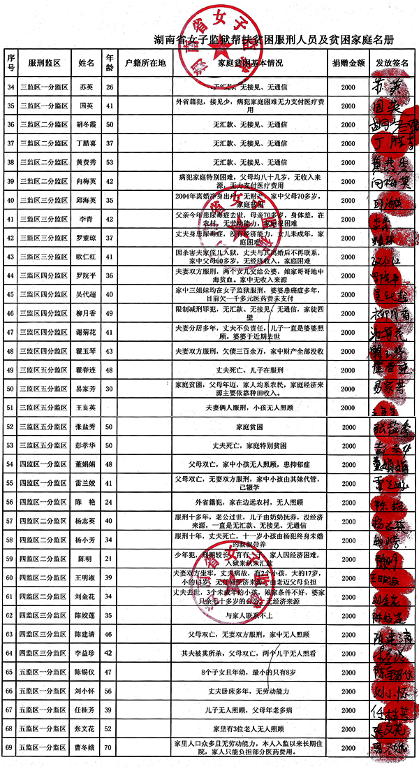 援助湖南省女子监狱特困服刑人员贫困家庭(100位)