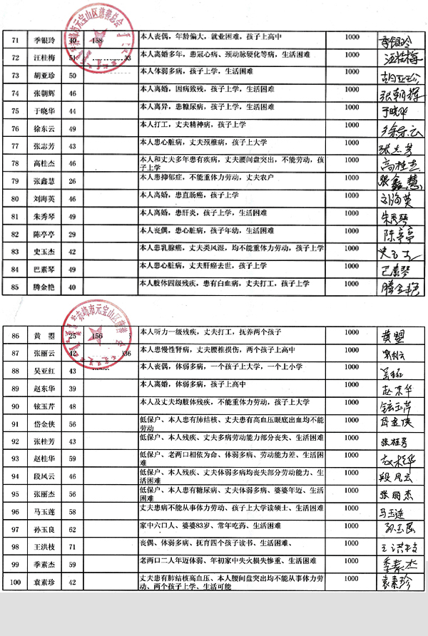 附援助名单:内蒙古赤峰市100位贫困母亲,每位贫困母亲发放善款1000元。)